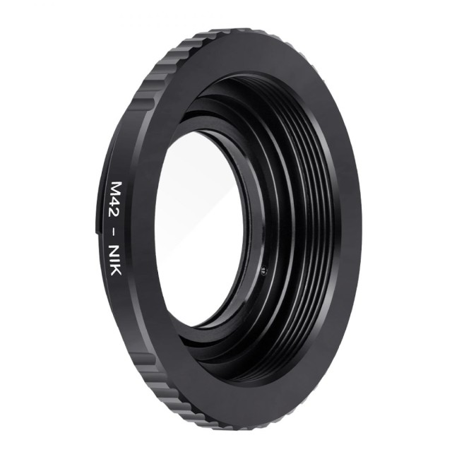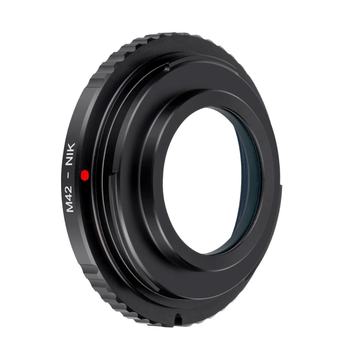 Der K&F M42-zu-Nikon-Objektivadapter mit optischem Glas ermöglicht die Verwendung von Objektiven mit M42-Anschluss an Nikon-DSLR-Kameras. Er zeichnet sich durch eine robuste Konstruktion aus Messing und Aluminium, eine präzise manuelle Bedienung und integriertes optisches Glas für Unendlich-Fokus aus.