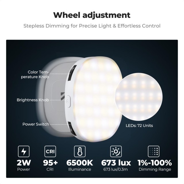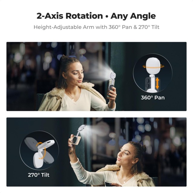 Das faltbare und ausziehbare Design ermöglicht eine flexible Positionierung mit vollständiger Drehung nach vorne und hinten, sodass Sie die vollständige kreative Kontrolle über Beleuchtungswinkel und -abstand haben. Zusammengeklappt ist die Leuchte so kompakt wie eine Puderdose, misst nur 6,4 × 7,5 × 2,3 cm und wiegt nur 93 g, sodass sie sich perfekt für Reisen, den täglichen Gebrauch und Aufnahmen unterwegs eignet.