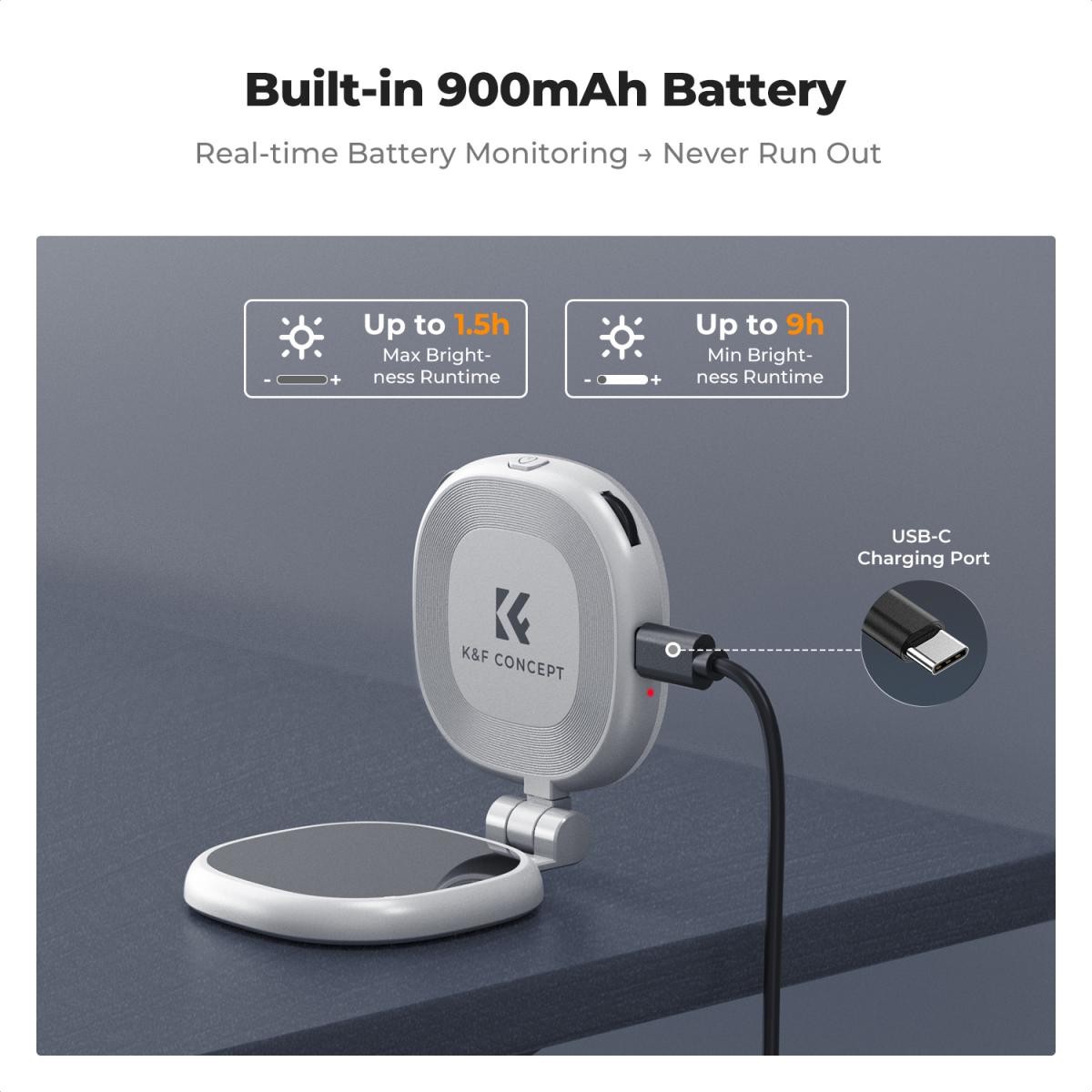 Ein integrierter hochauflösender Spiegel sorgt für zusätzlichen Komfort, da Sie vor der Aufnahme den Bildausschnitt, Ihre Körperhaltung oder Ihr Make-up überprüfen können. Die Leuchte wird mit einem 900-mAh-Akku betrieben und bietet je nach Helligkeitseinstellung eine Betriebsdauer von 1,5 bis 9 Stunden. Sie wird über einen universellen USB-C-Anschluss aufgeladen und verfügt über eine LED-Betriebsanzeige, damit Sie nie unvorbereitet sind.