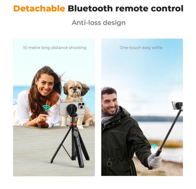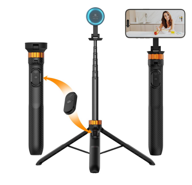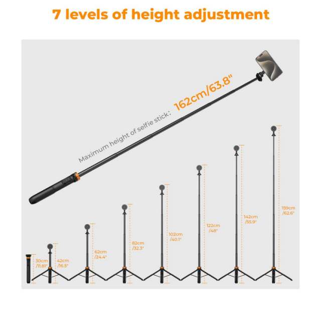Das K&F MS19 Handy-Stativ bietet eine außergewöhnliche Höhenflexibilität mit einer maximalen Auszugslänge von 162 cm und einer 7-fachen Beinverstellung, so dass Sie die ideale Höhe für jede Aufnahme einstellen können. Das Stativ verfügt über ein magnetisches Befestigungssystem, das eine schnelle und mühelose Verbindung zwischen dem Selfie-Stick und Ihrem Mobiltelefon ermöglicht. Dieses Stativ ist mit einer Vielzahl von Geräten kompatibel, darunter iPhone-Modelle vom 12 mini bis zum neuesten 15 Pro Max. Die magnetische Halterung sorgt für eine umfassende Aufnahmeabdeckung und eignet sich damit perfekt für Landschafts-, Porträt- oder Sportaufnahmen. Das Stativ ist mit einer Bluetooth-Fernbedienung ausgestattet und ermöglicht mühelose Selfie- und Reisefotografie. Es lässt sich mit nur einem Knopfdruck bedienen und bietet einen sicheren Schutz gegen Verrutschen mit bis zu 10 Stunden Dauerbetrieb. Die verbreiterte feste Struktur des Stativs und die rutschfesten Silikonpolster an der Unterseite erhöhen die Stabilität, während die eingebauten stoßdämpfenden Gummiringe im Fußrohr für zusätzliche Haltbarkeit und Stabilität sorgen.