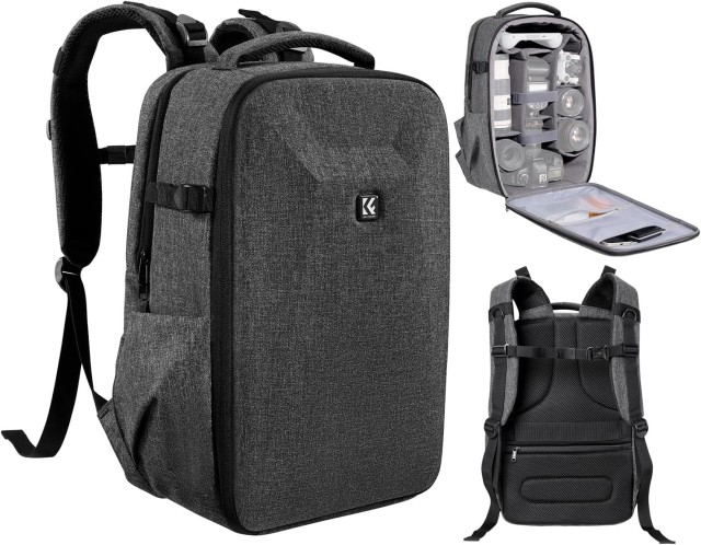 Dieser multifunktionale Hartschalen-Kamerarucksack ist für DSLR/SLR/spiegellose Kameras verschiedener Marken konzipiert. Die herausnehmbaren modularen Einsätze dienen als individuelle Trennwände für verschiedene Kameras, Blitze und Objektive. Die Rückentasche ist ein Laptopfach, das bis zu 15,6-Zoll-Laptops aufnehmen kann. Die vordere, vollständig zu öffnende Klappe mit Hartschale schützt Ihre Kamera vor Stößen und Kratzern. Kameratasche mit 2 internen Zubehörtaschen für Kabel, SD-Karten und Powerbank. 1 versteckte Reißverschlusstasche auf der Rückseite für Ihr Handy, Ihre Brieftasche und andere kleine Gegenstände. Die Stativhalterung ist mit einem sicheren Riemen an einer Seite der Tasche ausgestattet. 1 Tasche auf der anderen Seite bietet Platz für einen Regenschirm oder eine Wasserflasche.