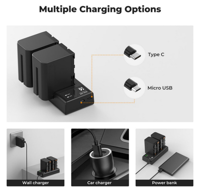 Ausreichende Stromversorgung: Enthält zwei NP-F970-Akkus mit einer realen Kapazität von 6600 mAh, die für eine längere Akkulaufzeit sorgen, damit Sie ohne Unterbrechungen fotografieren können.