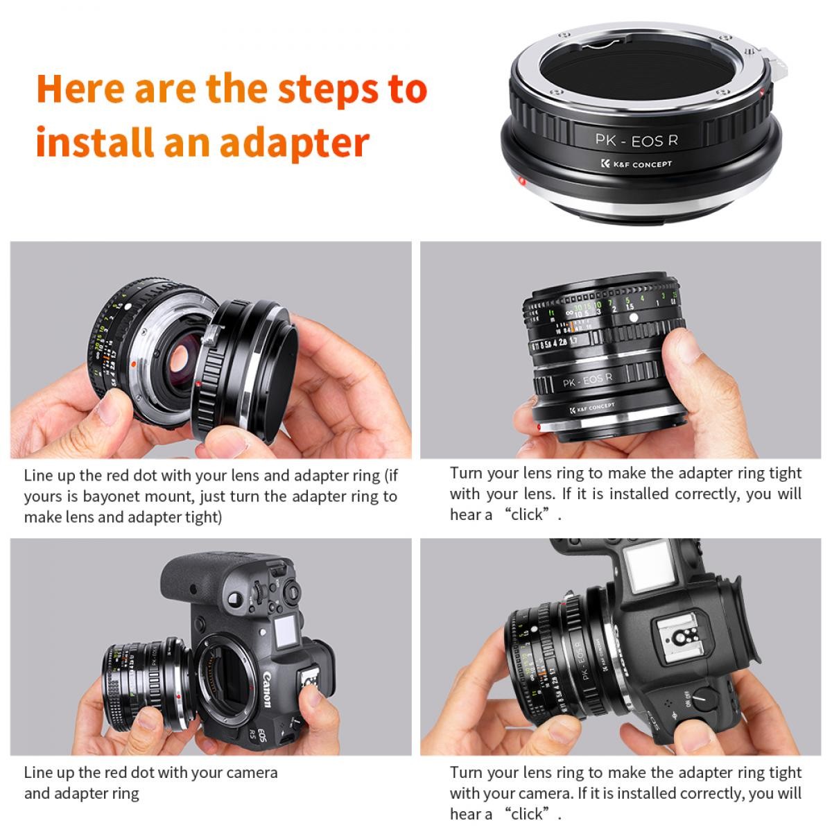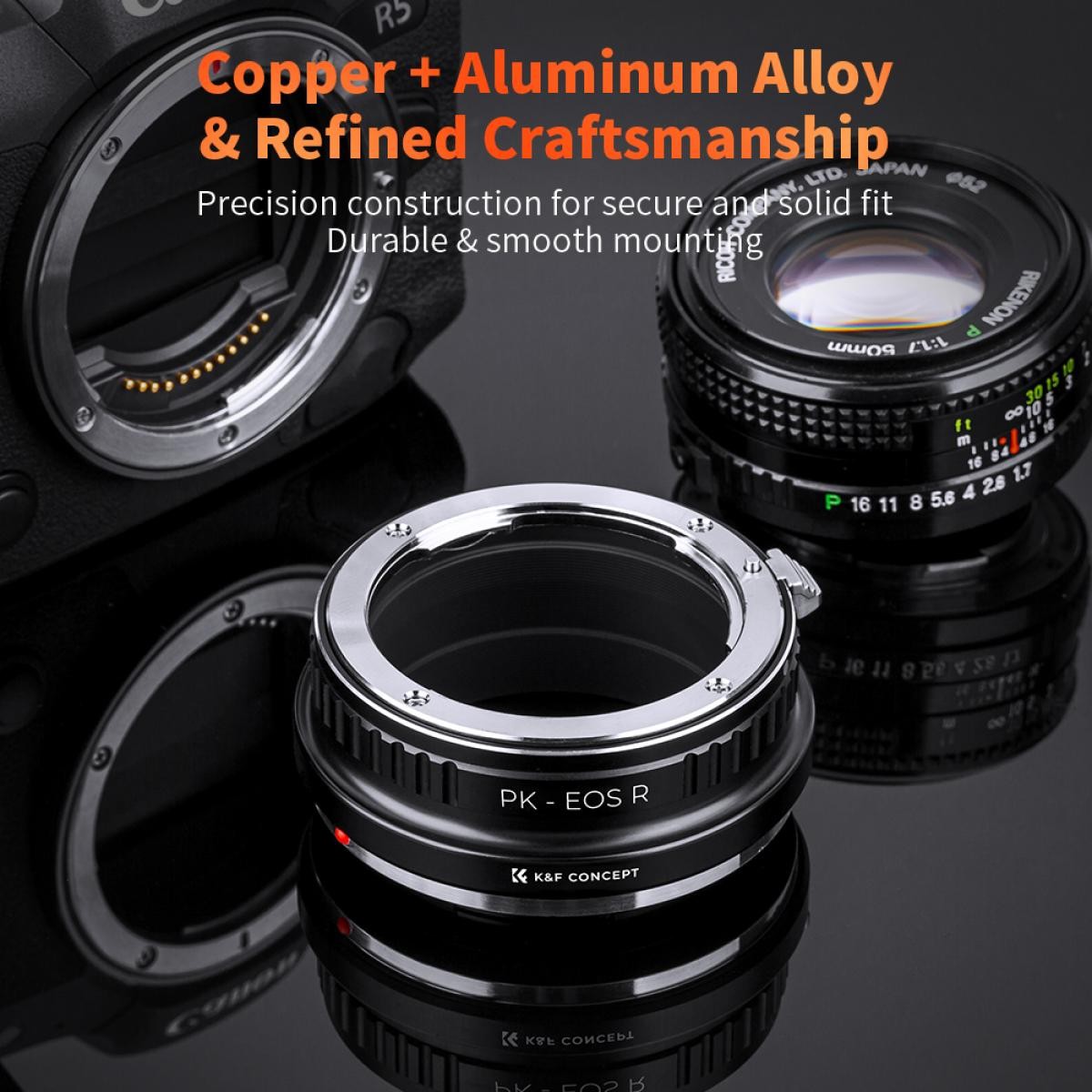 Der K&F Pentax K-Objektivadapter für Canon EOS R-Kameras wurde für Fotografen entwickelt, die die unverwechselbare Bildwiedergabe von Pentax K-Mount-Objektiven auf modernen spiegellosen Kameras der Canon EOS R-Serie genießen möchten. Der Adapter ist präzise aus hochwertigem Messing und Aluminium gefertigt und bietet eine sichere und stabile Verbindung bei gleichzeitig langer Lebensdauer. Dieser vollständig manuelle Adapter ermöglicht die manuelle Fokussierung und manuelle Blendensteuerung direkt vom Objektiv aus und unterstützt die Unendlichkeitsfokussierung für vielseitige und präzise Aufnahmen. Er ist ideal für kreative Experimente mit älteren Objektiven und bietet eine zuverlässige, hochpräzise Passform sowohl für gelegentliche Aufnahmen als auch für professionelle Arbeiten. Bei schweren oder großen Objektiven – insbesondere bei Mittelformatobjektiven – wird die Verwendung einer Telebügelhalterung oder eines Stativs empfohlen, um während des Gebrauchs ein stabiles Gleichgewicht zu gewährleisten.