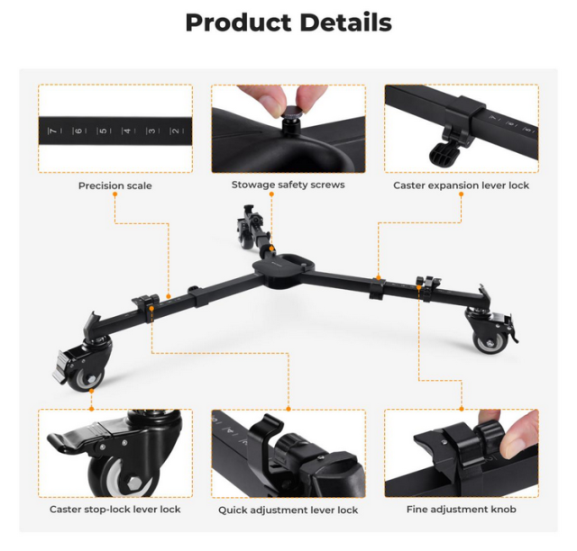 - Benutzerfreundliches Design: Der Kamerawagen verfügt über Schnallenverschlüsse zur schnellen Einstellung der Räder und Klettverschlüsse zur Sicherung der Beine im zusammengeklappten Zustand, um Bewegungen und Schäden beim Transport zu verhindern.