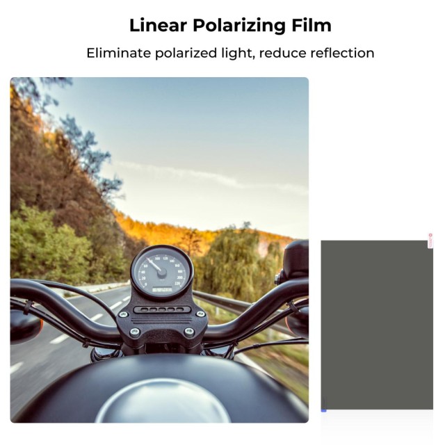 Die Folie misst 20 × 30 cm (7,8 × 11,8 Zoll) und ist nur 0,21 mm dünn. Sie verfügt über Schutzschichten auf beiden Seiten – eine klebende und eine nicht klebende – für eine saubere Handhabung und genaue Platzierung. Klare rote und blaue Markierungen helfen bei der Unterscheidung zwischen der klebenden (rot) und der nicht klebenden (blau) Seite und vereinfachen so die Installation. Der mitgelieferte Schaber, das Trockentuch und das mit Alkohol befeuchtete Tuch sorgen für eine staub- und blasenfreie Anwendung. Drehen Sie die Folie, um den optimalen Polarisationswinkel zu finden, schneiden Sie sie auf die gewünschte Größe zu und bringen Sie sie an, um sofortige Ergebnisse zu erzielen.