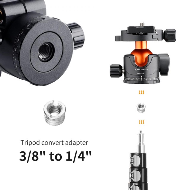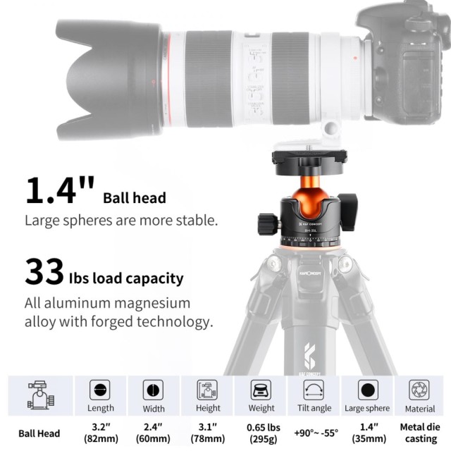 K&F Concept Professioneller 35mm Metall-Stativ-Kugelkopf 15kg/33lbs Belastung 360 Grad drehbarer Panoramakopf mit 1/4 Zoll Schnellwechselplatte K&F Concept-35 Serie. 2 Kugelumlaufspindeln - Ein ungefährer Bereich von +90° bis -55° kann schnell gesteuert werden.