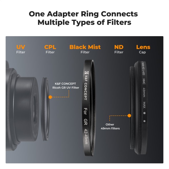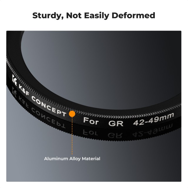Das K&F Ricoh GR 42-49mm Adapterring- und Objektivkappenset wurde speziell für Ricoh GR IIIx, GR III und GR II Kameras entwickelt und ermöglicht es Ihnen, Ihr kreatives Potenzial zu erweitern, indem Sie einen beliebigen 49mm-Filter an Ihrer Kamera anbringen. Der Adapterring besteht aus einer hochwertigen Aluminiumlegierung, die eine robuste und sichere Installation für eine stabile Leistung gewährleistet.
