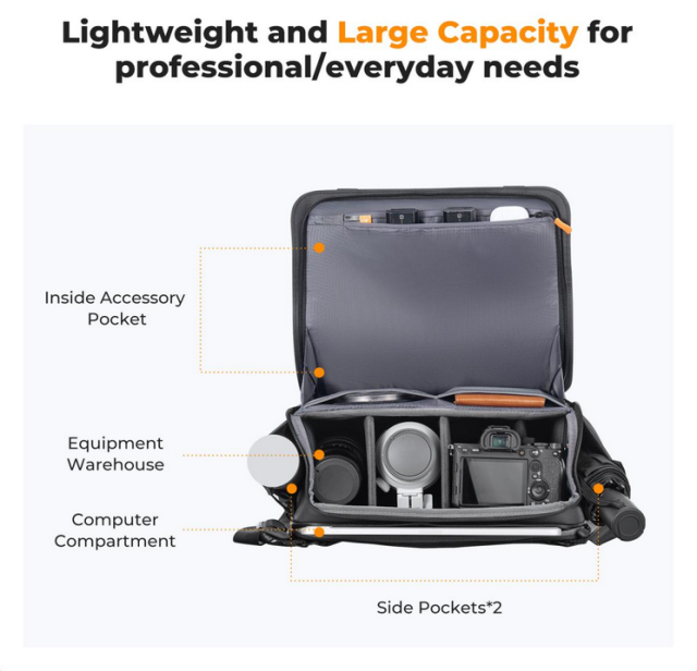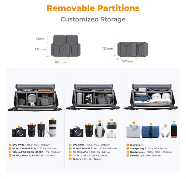 Die K&F Sling Bag 10L U10 kombiniert Stil und Funktionalität mit einem geräumigen Design, anpassbaren Fächern und mehreren Zubehörtaschen. Sie ist ideal für den Transport von Kameraausrüstung, Geräten und anderen wichtigen Utensilien. Außerdem bietet sie ein Fach für ein 13" MacBook Pro und einen speziellen Platz für ein kleines Stativ.