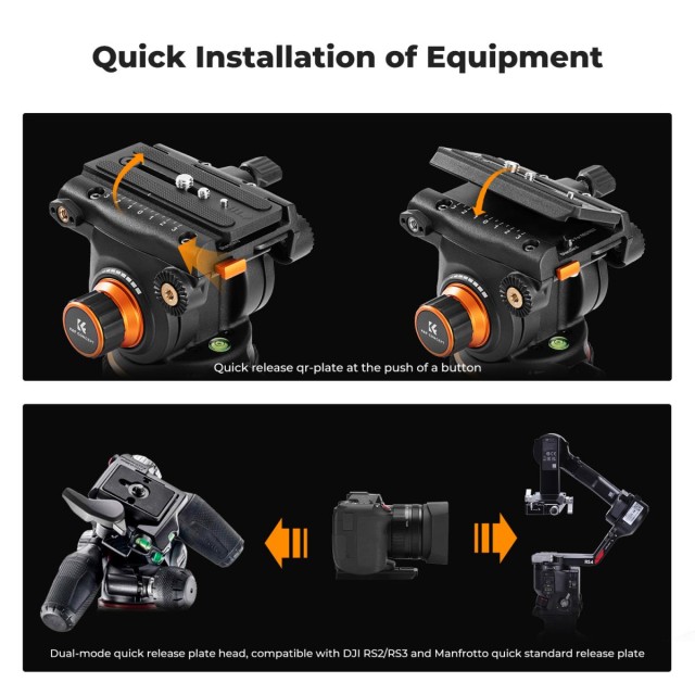 - Der Fluidkopf in Profiqualität sorgt für sanfte Kamerabewegungen, eignet sich für Videos und feine Kompositionen und gewährleistet Aufnahmestabilität. Panoramaaufnahmen sind mit einer stufenlos einstellbaren Dämpfung ausgestattet, mit der sich das Dämpfungsgefühl leicht anpassen und eine horizontale 360-Grad-Drehung erreichen lässt, was eine präzise Steuerung und schnelle Anpassung für mehr Aufnahmeanforderungen ermöglicht.
