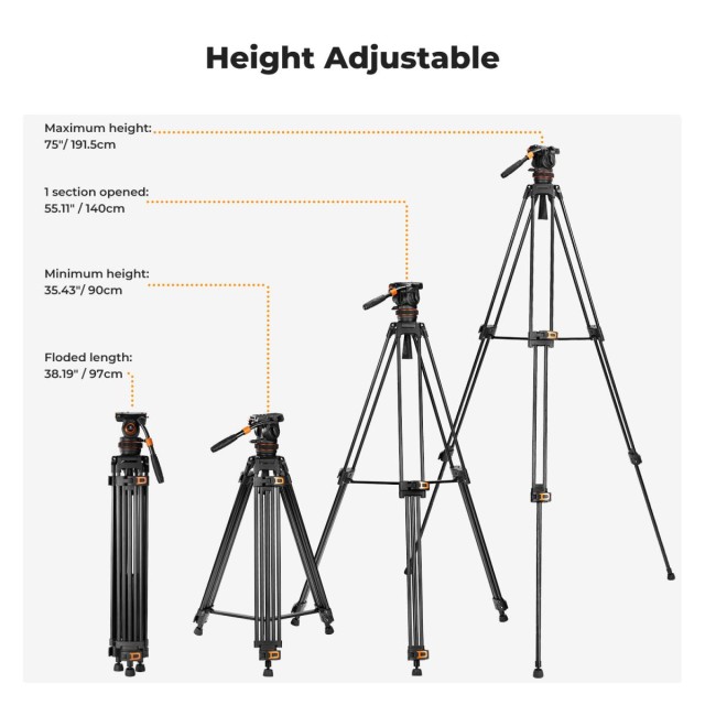 10KG Tragfähigkeit Fluidkopf-Stativ Kamerastativ Maximale Höhe 75,2"/1,91m Video-Stativ VA3+BV20. Der Fluidkopf in Profiqualität sorgt für reibungslose Kamerabewegungen, eignet sich für Videos und feine Kompositionen und gewährleistet Aufnahmestabilität. Panorama-Aufnahmen ist mit stufenlos einstellbarer Dämpfung ausgestattet, die leicht das Dämpfungsgefühl einstellen und 360-Grad-Horizontaldrehung erreichen kann, was eine präzise Steuerung und schnelle Einstellung bietet, um mehr Aufnahmeanforderungen zu erfüllen.