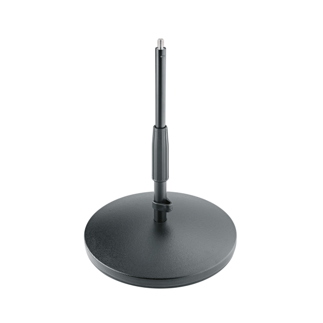 Niedriges Stativ mit schwerem Gusseisenfuß für maximale Stabilität. Gut geeignet für die Mikrofonierung von Verstärkern, Schlagzeug usw. Der runde Gummieinsatzring filtert Trittschall und reduziert die Übertragung unerwünschter Geräusche. Schlanke, verstellbare Kupplung für einfache Höheneinstellung.