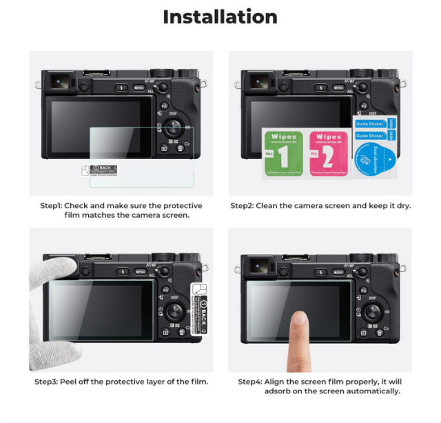 Das Kit enthält 3x Displayschutzfolien und 3x Blitzschuhabdeckungen, die eine präzise und blasenfreie Installation gewährleisten.
