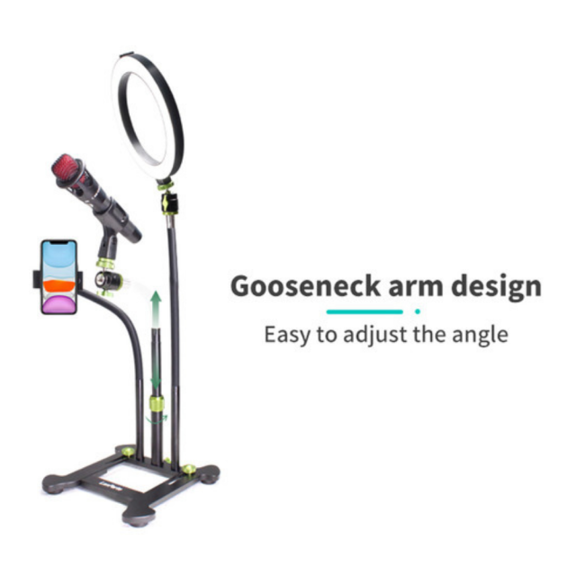 Filmen Sie Vlogs, Livestreams und vieles mehr von jeder flachen Oberfläche aus mit dem Livestream Desktop Smartphone Stand von LanParte. Der Tischständer verfügt über drei verstellbare Schwanenhalsarme, die in einem Mikrofonhalter, einer Smartphone-Klemme und einer Halterung für ein LED-Ringlicht enden, alle mit voll verstellbaren Kugelgelenken. Mit all dem optionalen Zubehör bietet Ihnen dieser Ständer alles, was Sie brauchen, um Ihre Inhalte für einen ausgefeilten und professionellen Look aufzuwerten.