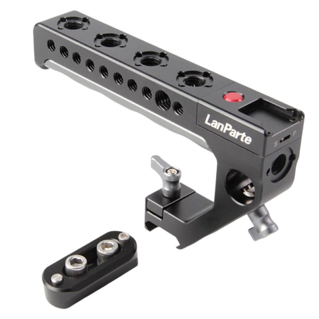 Der Griff wird mit einem 3/8"-16-Gewinde mit ARRI-kompatiblen Verdrehsicherungsstiften befestigt, um den Griff sicher an der Kamera oder dem Käfig zu fixieren und ein Verdrehen zu verhindern. Der Griff bietet eine Fülle von Befestigungsmöglichkeiten für Zubehör, darunter zwei Kaltstutzen, fünf ARRI-Zubehörhalterungen, 1/4"-20- und 3/8"-16-Gewindebohrungen sowie eine 15-mm-Stangenbohrung.