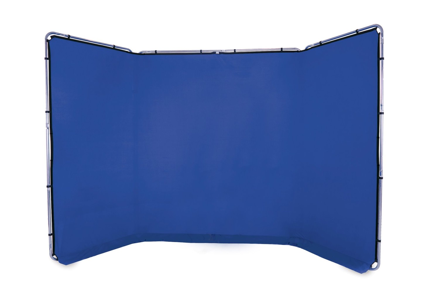 Vollständig verspannt kann er z. B. an eine Wand gelehnt werden, oder durch leichtes Versetzen der Seitenrahmen auf jeder ebenen Fläche ohne Stütze stabilisiert werden. Die Farbvariante Chroma Key Blue (Keying Green) wird einfach mit den mitgelieferten Haken an den Aluminiumrahmen geklippt, so dass eine glatte Oberfläche ohne Verschiebungen oder Übergänge entsteht.