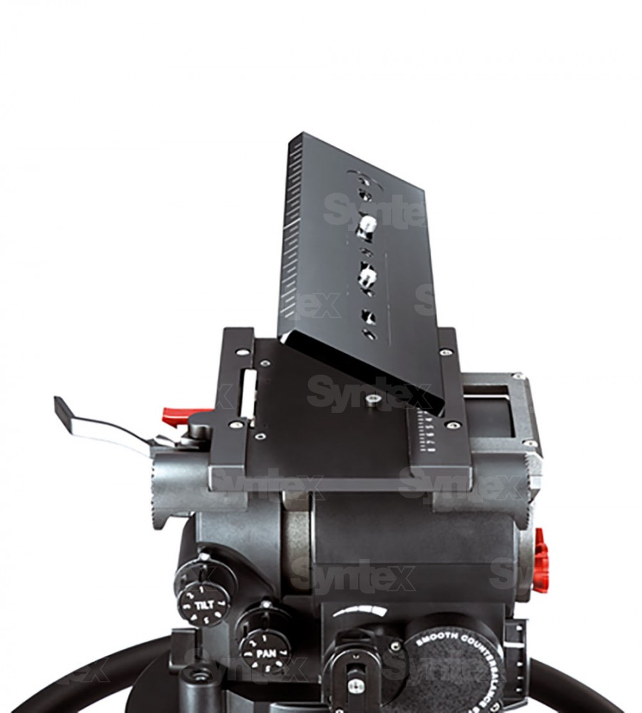 Moderner Kopf für Studiokameras mit Schnellwechselplatte. Tragfähigkeit 69 kg, stufenloser Gegengewichtsbereich 28 - 65 kg, Neigung +90° / -70°, Plattenverschiebung +/-75 mm, Gewicht 12,7 kg. Befestigung der Kamera mit zwei 3/8"-Schrauben.