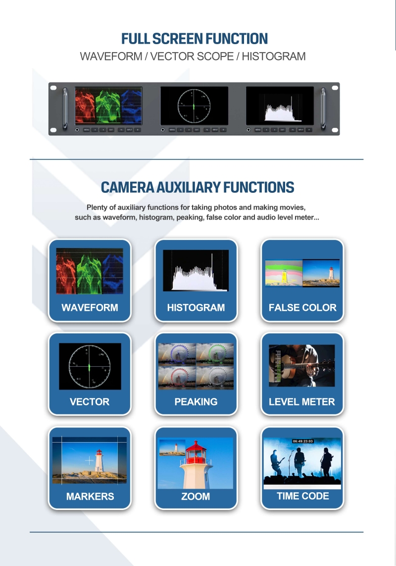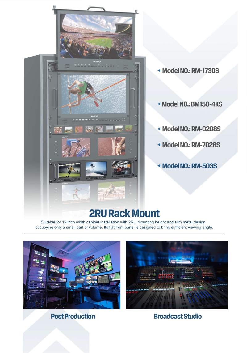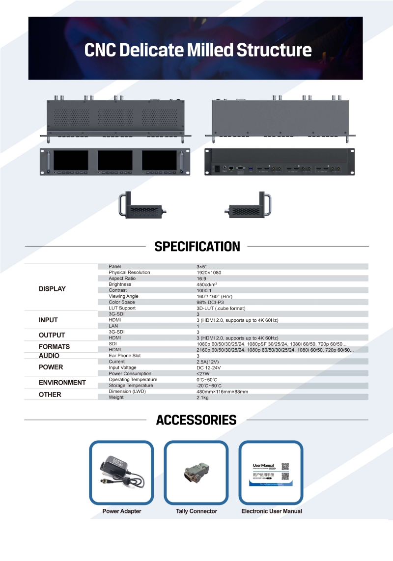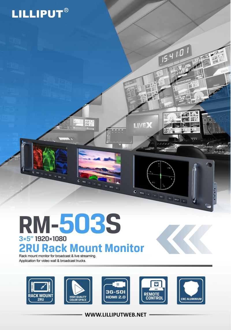 Der RM-503S 5" 3G-SDI/HDMI-Rackmount-Monitor von Lilliput verfügt über drei 5"-LED-Displays, jedes mit einer Helligkeit von 450 cd/m² und einer Full HD-Auflösung von 1920 x 1080. Das 2 RU Rack-montierbare Metallgehäuse hat zwei eingebaute Griffe, um die Montage und Demontage an Ihrer Videowand oder Ihrem mobilen Broadcast-System zu erleichtern. Mit integrierter 3D-LUT und HDR-Unterstützung ist der RM-503S wie geschaffen für Broadcast-, Postproduktions- und Live-Streaming-Anwendungen.
