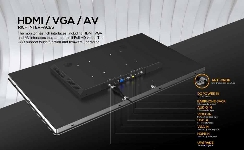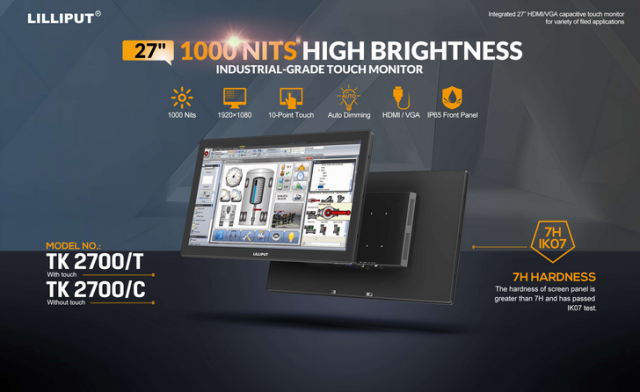 Der Lilliput TK2700-NP/C ist ein 27-Zoll-Monitor mit Metallrahmen und einem kapazitiven 10-Punkt-Touchscreen mit einer hohen Helligkeit von 1000 Nit. Er verfügt über HDMI-, VGA- und RCA/Composite-Eingänge, eine blendfreie/fingerabdruckabweisende/UV-beständige Beschichtung, eine handschuhfähige Touch-Funktion, eine wasser- und staubgeschützte Frontblende gemäß IP65/NEMA 4, eine Oberflächenhärte von 7H und einen Aufprallschutz nach IK07. Damit eignet er sich ideal für den robusten Einsatz im öffentlichen Bereich.