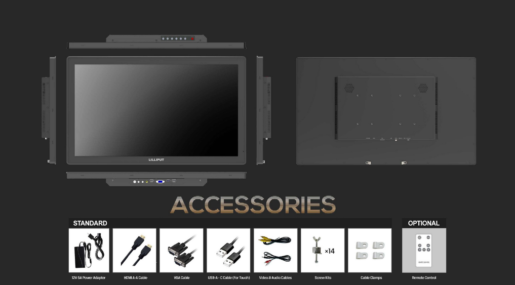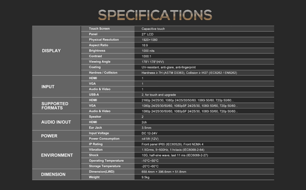 Der Lilliput TK2700-NP/C ist ein 27-Zoll-Metallmonitor – der größte der TK-Reihe von Monitoren mit Metallrahmen –, der mit einem kapazitiven 10-Punkt-Touchscreen und einem hochauflösenden Bildschirm mit 1000 Nits ausgestattet ist. Zu den Eingangsoptionen gehören HDMI, VGA und – für ältere Videoquellen – auch RCA-/Composite-Eingänge. Das Panel wurde speziell für dieses Monitormodell hergestellt und verfügt über eine Blendschutzbeschichtung, eine Anti-Fingerabdruck-Behandlung, um Verschmutzungen durch Berührungen des Monitors zu verhindern, sowie UV-Beständigkeit für eine klare Sichtbarkeit im Außenbereich. Die physikalischen Eigenschaften des Geräts sind beeindruckend und für den Einsatz in der Öffentlichkeit ausgelegt. Es unterstützt die Bedienung mit Handschuhen, verfügt über eine wasser- und staubgeschützte Frontblende nach IP65/NEMA 4, eine Härte von 7H und eine Schlagfestigkeit von IK07, was es zu einem soliden, robusten Monitor macht.