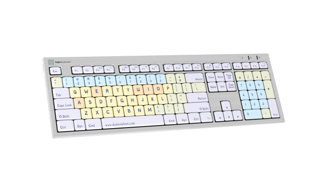 Neben der speziellen Dyslexie-Schrift enthält die Tastatur auch farbcodierte Vokale, Konsonanten, Zahlen und Funktionstasten und hilft dem Benutzer, die Position von Buchstaben, Zahlen und anderen Tasten auf der Tastatur zu lernen.