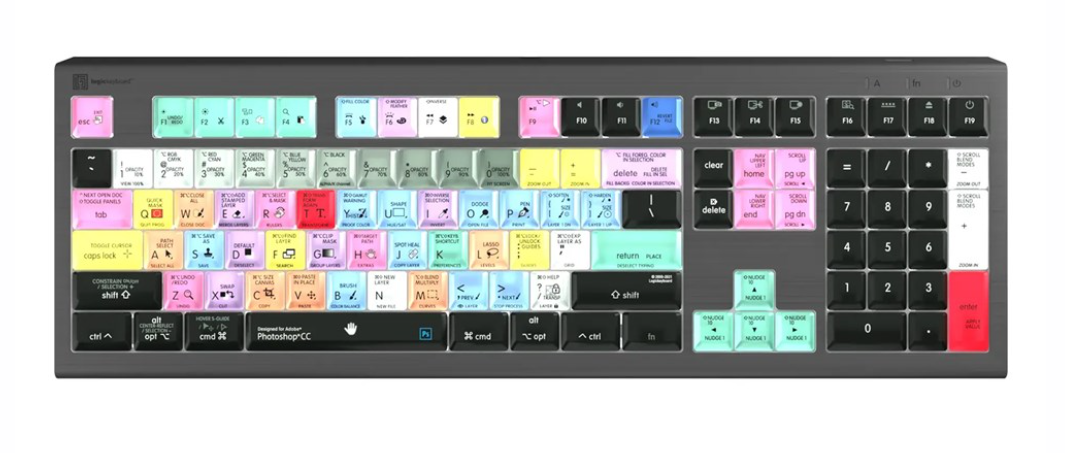 Die Logickeyboard Adobe Photoshop CC Astra 2 Mac-Tastatur ist das ultimative Werkzeug für Photoshop-Profis und -Enthusiasten und wurde entwickelt, um Ihre Bearbeitungsgeschwindigkeit und -genauigkeit zu steigern. Diese Spezialtastatur verfügt über mehr als 140 Photoshop CC-Tastenkombinationen mit klarer, farbcodierter Beschriftung direkt auf den Tasten, was einen intuitiven, schnellen Zugriff ermöglicht, ohne dass Sie sich durch komplexe Menüs navigieren oder Befehle auswendig lernen müssen.