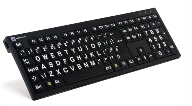 Die Logickeyboard XLPrint NERO PC-Tastatur in Weiß auf Schwarz ist eine Tastatur mit großer Schrift und hohem Kontrast, die speziell für sehbehinderte Nutzer entwickelt wurde und Barrierefreiheit mit professioneller Funktionalität verbindet. Mit taktilen Scherenmechanik-Tasten, integrierten USB-Hubs und einer mitgelieferten LogiLight-LED-Lampe bietet sie Komfort, Benutzerfreundlichkeit und Produktivität in jeder Umgebung.