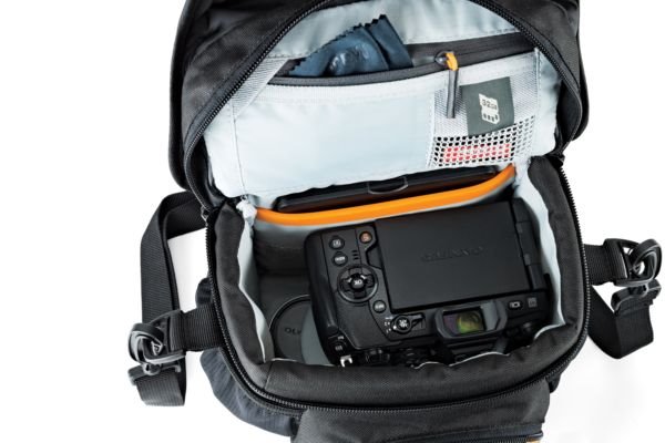 Ausreichend Platz: Das Hauptfach verfügt über ein separates Fach für ein Smartphone oder Tablet. Außerdem gibt es ein transparentes Fach für Speicherkarten und eine Reißverschlusstasche an der Innenseite des Hauptfachdeckels. Die Vordertasche mit Reißverschluss, die vom Deckel des Hauptfachs verdeckt wird, bietet eine ausgeklügelte interne Organisation. Außerdem ist die Vordertasche mit einem wasserdichten Reißverschluss ausgestattet.