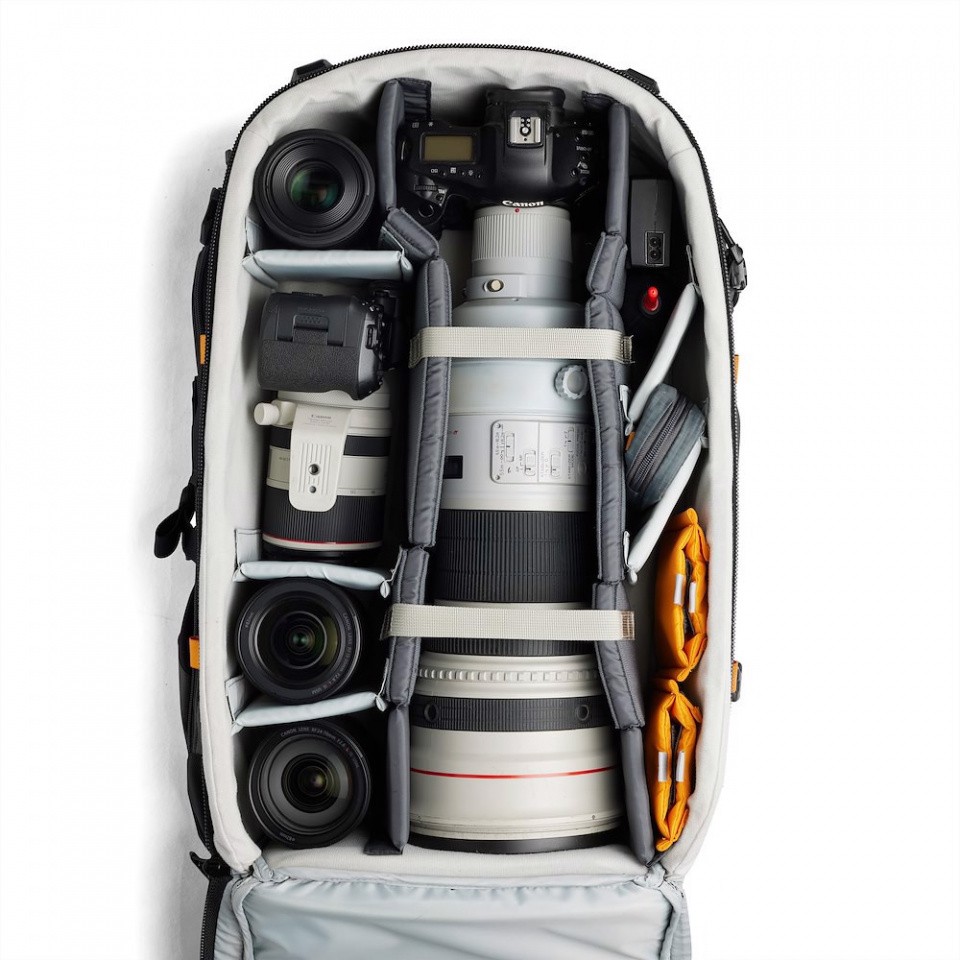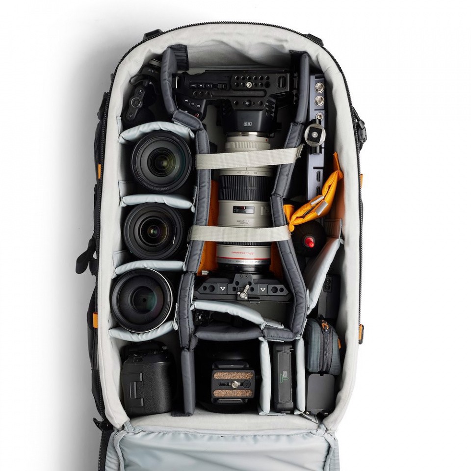 Das Hauptfach für die Kamera ist von der Rückseite zugänglich und so konzipiert, dass es maximalen Platz und variable Anordnungsmöglichkeiten bietet. Es fasst ein Objektiv bis zu 800 mm f/5,6 auf einer DSLR mit Porträtgriff oder ein CN20-Objektiv auf einem RED-Gehäuse für Naturfilmer sowie eine professionelle Drohnenausrüstung.