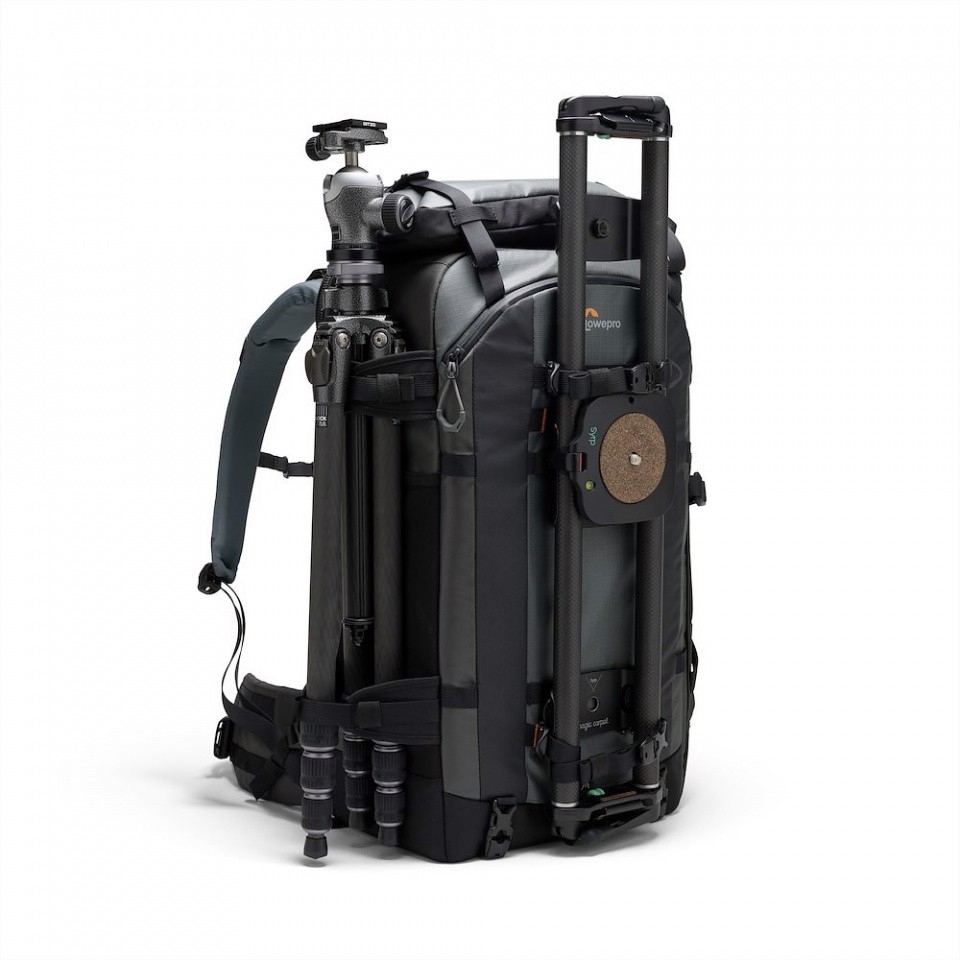 Cross-Funktionalität und individuelle Konfiguration sind dank eines Systems von Schlaufen, zwei mitgelieferten Zubehörgurten und einer ausziehbaren Stativhalterung mit Reißverschluss in der Vordertasche möglich. Wenn Sie zwei Stative transportieren müssen oder eine seitliche Befestigung bevorzugen, stehen an der Seite des Rucksacks spezielle Stativgurte zur Verfügung. Die Vorder- und Seitenpartie sind so konzipiert, dass sie eine Vielzahl von Stativen aufnehmen können, darunter auch Modelle bis zur Größe Gitzo Systematic.