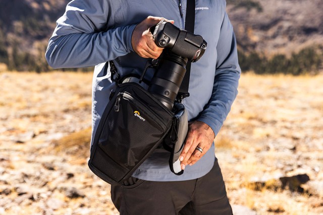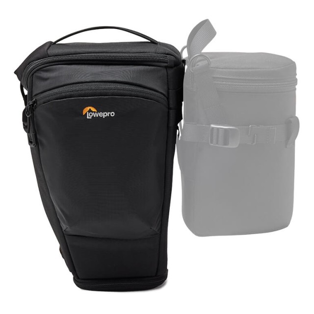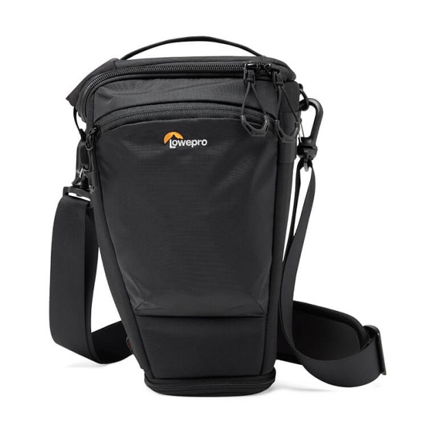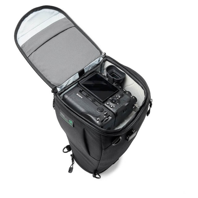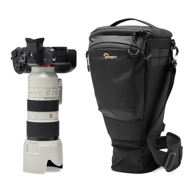 TopLoader passt auf Vollformat-Gehäuse mit Griff und Objektiv bis zu 70-200 mm F2,8, mit Erweiterung für Gegenlichtblende. Kompatibel mit SlipLock-Zubehör wie Objektivtaschen