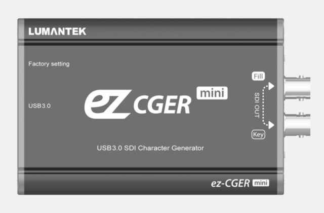 Mit seiner Mini-Konvertergröße und dem einfachen USB 3.0-Anschluss erzeugt der ez-CGER mini Fill & Key im SDI-Format. Schließen Sie diese an Ihren eigenen Video-Switcher an, um Ihr Video mit CG live zu übertragen! Fügen Sie Bilder, Videos, Textdateien und mehr mit LUMANTEKs spezieller Software ez-CGER ein.