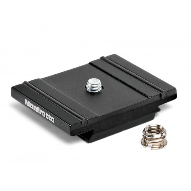 Aluminium-Schnellwechselplatte mit der Möglichkeit der Befestigung an Manfrotto-Köpfen mit 200PL-Standard und an Köpfen mit Arca-swiss-Standard. Ausgestattet mit 1/4"-Gewinde und 3/8"-Adapter.
