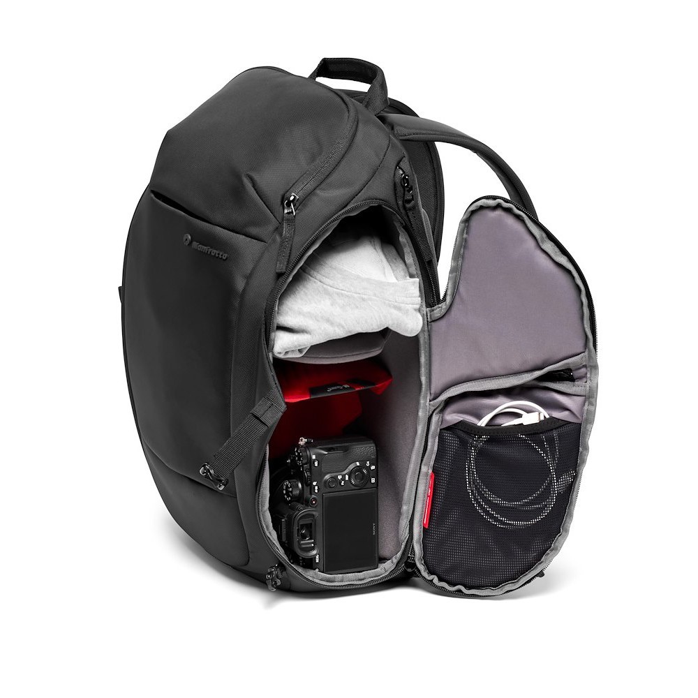 Der Manfrotto Advanced Travel Backpack III ist ein unverzichtbarer kompakter und leicht zu transportierender Rucksack für Kamera und Laptop für Ihre Reisen. Dieser originelle Rucksack wurde für DSLRs oder spiegellose Kameras entwickelt und dient zur Aufbewahrung und zum Transport Ihrer Fotoausrüstung und Ihres Medienzubehörs. Mit einem von einer Seite des Rucksacks zugänglichen oberen und unteren Fach und einer erweiterbaren Seitentasche können Sie diesen Rucksack an Ihre Bedürfnisse anpassen. Er bietet Platz für eine DSLR-Kamera wie die Canon EOS 5D Mark IV und zusätzlich 3-4 Objektive, je nach Größe (z. B. 16-35/2,8, 24-70/2,8 oder 70-200/2,8). Alternativ bietet er Platz für eine spiegellose Kamera wie eine Sony Alpha mit einem 70-200 mm f/4-Objektiv sowie eine DJI Mavic Pro 2 mit mehreren Akkus und einer Fernbedienung. Das gepolsterte Kamerafach ist mit dem brandneuen Manfrotto M-Guard™ Protection System ausgestattet. Dieses System besteht aus speziellem EVA-Schaumstoff mit hoher Dichte, der eine außergewöhnliche Stoßdämpfung bei sehr dünnem Profil bietet. Anpassbare Faltmuster ermöglichen maximale Vielseitigkeit für den vollständigen Schutz Ihrer Fotoausrüstung bei maximaler Raumnutzung. Wenn Sie mehr Platz benötigen, bietet die erweiterbare gepolsterte Seitentasche zusätzlichen Platz für ein Reisestativ oder einen Handstabilisator wie den DJI Osmo Mobile 2. Der Rucksack verfügt außerdem über eine intelligente externe Befestigungsmöglichkeit für ein Stativ an der Vorderseite. Dank praktischer seitlicher Zugänge haben Sie Ihre Ausrüstung immer griffbereit und verpassen keine wichtige Aufnahme mehr. Das obere Fach eignet sich ideal für Zubehör und persönliche Gegenstände. Dank dieses Designs müssen Sie nie wieder nach den benötigten Dingen suchen. Zu den weiteren Merkmalen gehört ein spezielles 15-Zoll-Laptopfach, das für zusätzlichen Schutz gepolstert und unterwegs leicht zugänglich ist. Dieser Rucksack lässt sich auch leicht in einen Tagesrucksack umwandeln, indem Sie einfach die Trennwände entfernen. Alle Außenstoffe sind wasserabweisend behandelt und können bei schlechtem Wetter mit der mitgelieferten Regenhülle zusätzlich verstärkt werden.