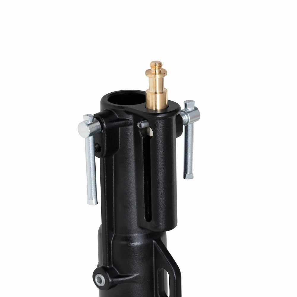 Der Manfrotto 298B kombiniert einen breiten schwarzen Stahlfuß (mit drei feststellbaren Rollen und einem verstellbaren Nivellierfuß) mit drei silbernen Aluminiumteilen, die sich über zwei Steigrohre reibungslos auf 300 cm ausziehen lassen. Die rechteckigen Stahlbeine lassen sich für den Transport flach zusammenklappen, während der Nivellierfuß Unebenheiten des Bodens bis zu ±15° ausgleicht. Mit einem abnehmbaren 5/8" (16 mm) Baby-Stift und einem 3/8"-16-Gewinde (1/4"-20-Reduzierstück erhältlich) ist er perfekt für Porträtstudios, Videodrehs oder Verleihsets, die einen stabilen Ständer mit Rädern benötigen, der 15 kg in Nahaufnahme oder 5 kg bei voller Höhe trägt – zuverlässige Haltbarkeit für den täglichen professionellen Einsatz.