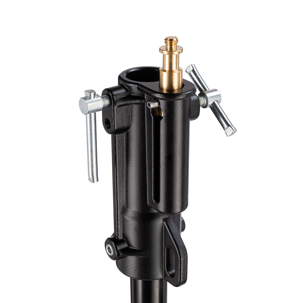 Der Manfrotto 142B ist die schwarze Version der legendären Heavy-Duty-Stativverlängerung von Manfrotto. Zwei dicke Aluminiumteile (ein Riser) mit großen Klemmringen sorgen für eine stabile maximale Höhe von 210 cm und tragen dennoch die volle Studioauslastung. Der untere Teil ist ein 28 mm (1-1/8″) Junior-Steckanschluss, der obere Teil ist eine 28 mm Junior-Buchse + 16 mm Baby-Bolzen + 3/8″-Gewinde. Wenn Sie einen 12×12-Rahmen, eine große HMI-Leuchte oder eine Softbox höher als Ihr Wind-up- oder C-Stativ erreichen müssen, setzen Sie einfach den 142B auf und schon sind Sie fertig.