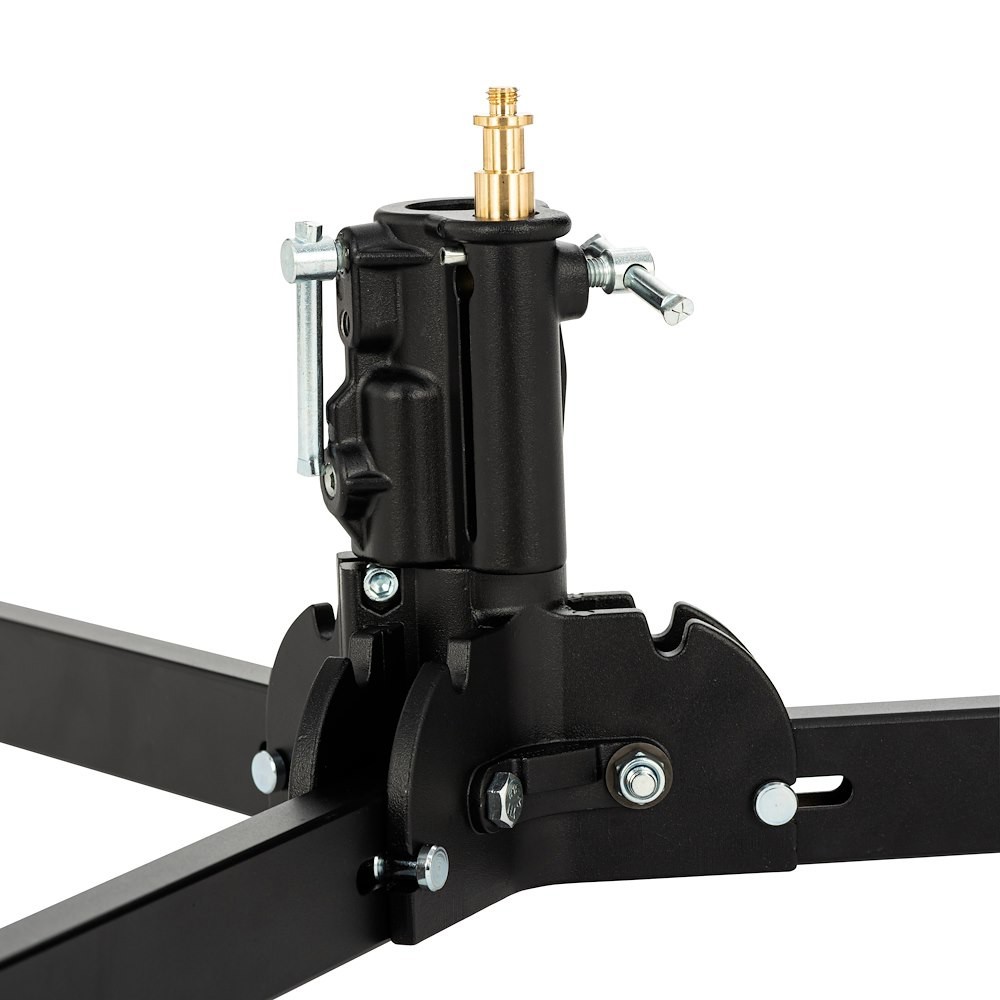 Die Manfrotto 299FBASE verwandelt jede 35-mm-C-Stand-Säule in einen kompakten Hintergrundbeleuchtungsständer. Die schwarz pulverbeschichtete Stahlspinne verfügt über drei rechteckige Beine (20 × 40 mm), die sich zur Aufbewahrung auf 36 cm zusammenklappen lassen, während ein einzelnes Nivellierbein ±15° für unebene Böden einstellbar ist. Eine universelle 28-mm-Innengewindebuchse nimmt Standardzapfen auf, und der mitgelieferte 16-mm-Babybolzen ermöglicht die direkte Befestigung von Leuchten. Mit einer Nennlast von 40 kg ist er die ideale Basis für Junior-LEDs, kleine Fresnel-Scheinwerfer oder Auslegerarme in Film-, Video- oder Fotostudios – kombinieren Sie ihn mit Rollen für sofortige Mobilität.