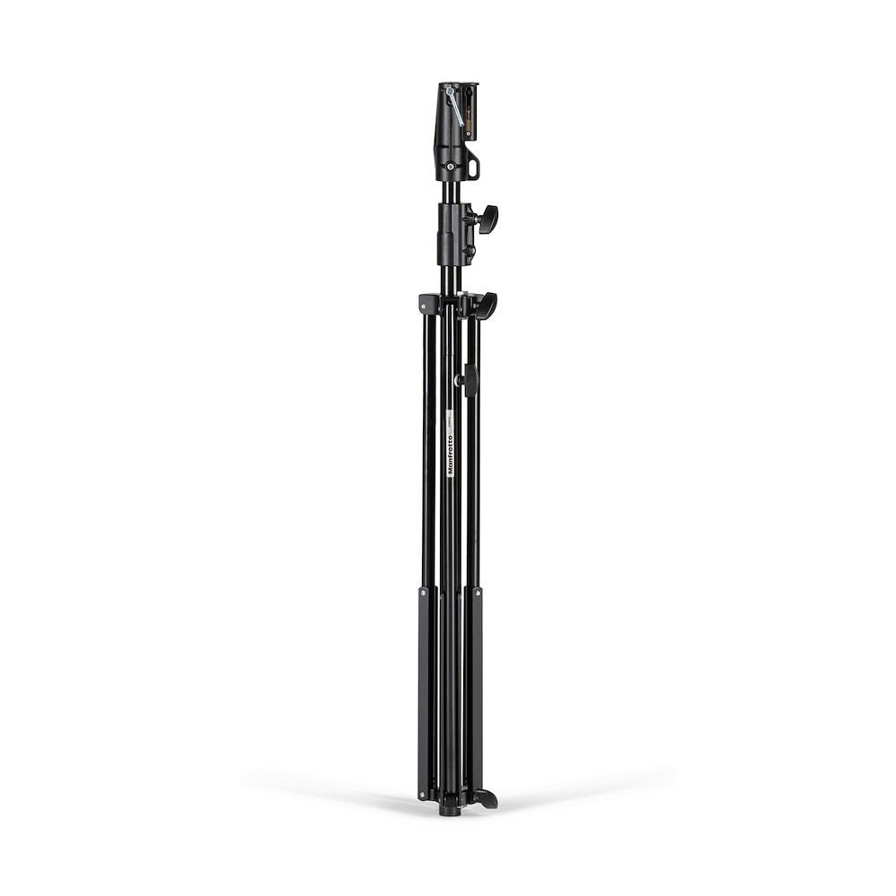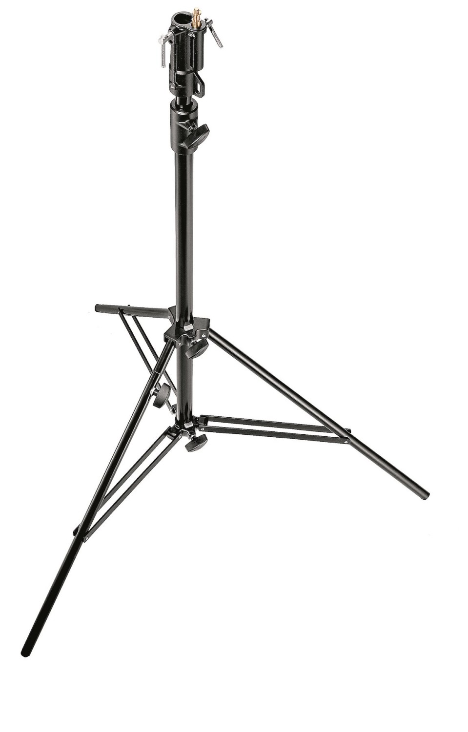 Der Manfrotto 008BSU Junior-Stativ aus schwarzem Zinkstahl ist ein 2-teiliges, 1-Riser-Hochleistungsstativ mit einer Auszugslänge von 116–216 cm und einer Tragkraft von 30 kg, doppelt verstrebten Beinen, Nivellierfuß, universeller 28-mm-Buchse + 16-mm-Bolzenkopf und schwarzer Zinkbeschichtung – für felsenfeste Stabilität für mittelgroße Leuchten, Modifikatoren oder Ausleger im Studio oder vor Ort.