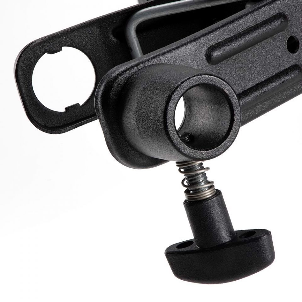 Mit einem Gewicht von nur 350 g verfügt die Klemme über einen extrem starken Federmechanismus, der einen festen Halt auf verschiedenen Oberflächen oder Objekten gewährleistet und eine Nutzlast von bis zu 2 kg bietet. Die Klemmbacken lassen sich bis zu einem maximalen Durchmesser von 40 mm ausfahren, so dass die Klemme problemlos an einer Stange, einem Regal, der Rückenlehne eines Stuhls oder sogar an einem Baumzweig befestigt werden kann, um nur einige der vielen Möglichkeiten zu nennen. Die Innenseite der Klemmbacken der Federklemme ist mit einer Reihe von haltbaren Hartgummistollen versehen, die für zusätzlichen Halt sorgen, was besonders auf unregelmäßig geformten Oberflächen nützlich ist.