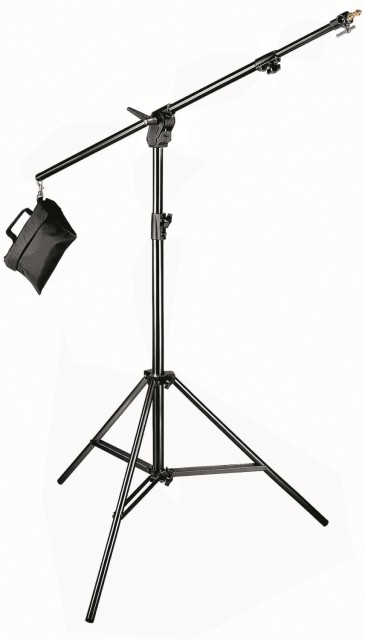 Toto je Manfrotto Combi Boom Stand. Když prodloužíte druhý segment tohoto černého hliníkového stativu na maximální délku a stisknete páku tak získáte stojan s dvoudílným ramenem. Při použití jako boom stand je jeho maximální zatížení 2 kg, což je dostatečné pro malé osvětlovací zařízení s malým softboxem nebo deštníkem. Součástí balení je protizávaží (prázdné) a jeho použití se doporučuje vždy, když je rameno prodlouženo.