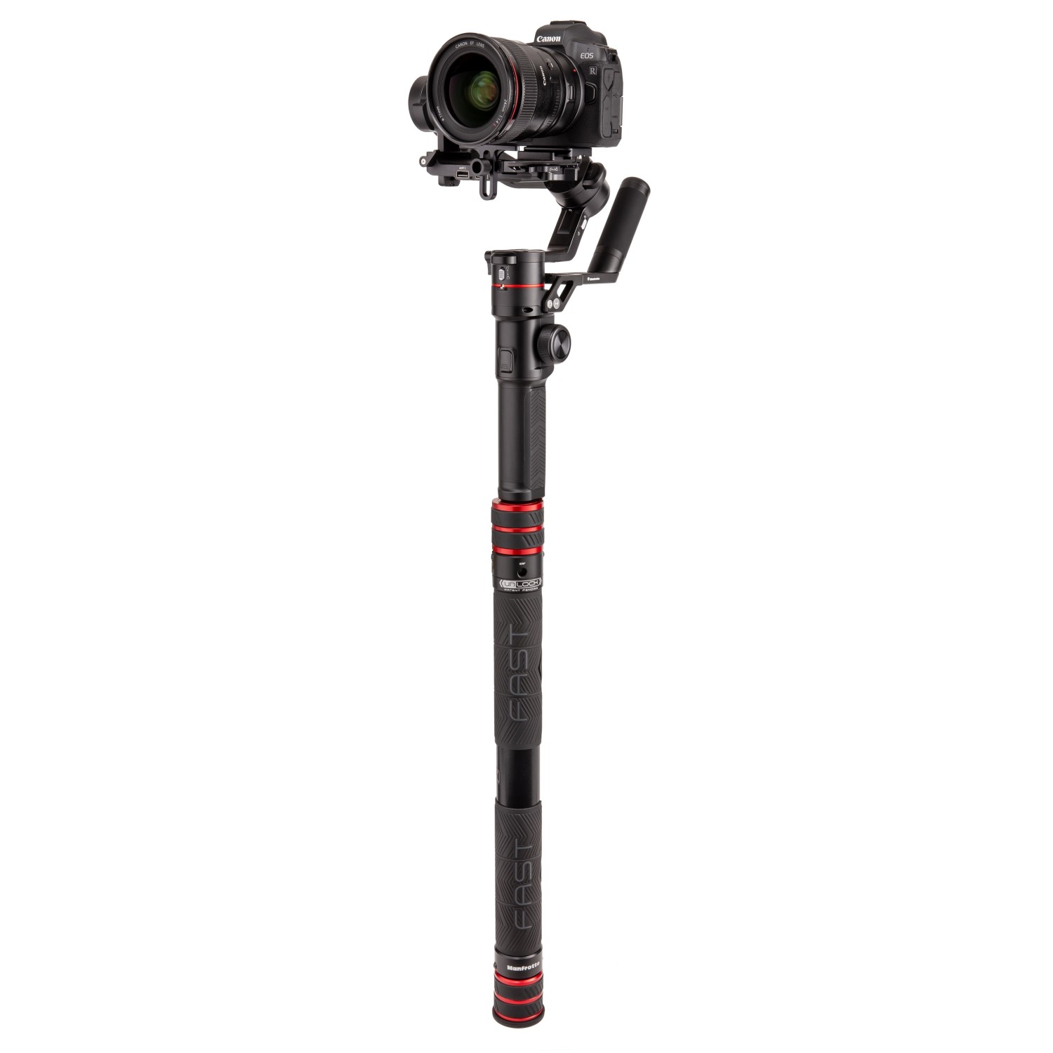 Der GimBoom lässt sich mit den standardmäßigen 3/8"- und 1/4"-Montageschrauben an der Oberseite leicht am Gimbal befestigen. Außerdem ist er äußerst kompakt (mit einer minimalen Arbeitshöhe von 51 cm lässt er sich leicht im Handgepäck verstauen) und wiegt nur 800 g. Dank seiner Kohlefaserkonstruktion ist der GimBoom unglaublich stabil und kann ein Gewicht von bis zu 6,5 kg tragen.