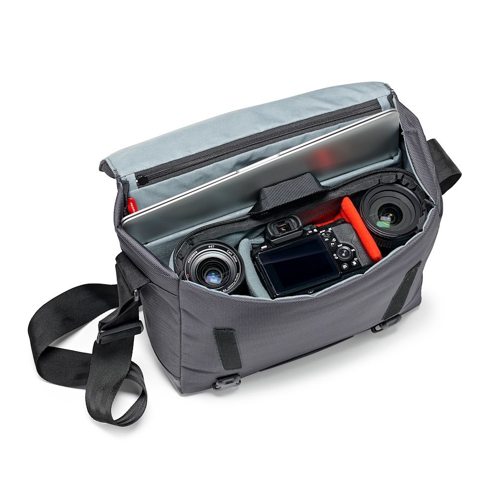 Die Manfrotto MB MN-M-SD-10 Manhattan Speedy-10 Messenger ist eine 880 g schwere graue Urban-Tasche aus ballistischem Nylon mit herausnehmbarem Flexy Camera Shell-Einsatz (26 × 10 × 19 cm), einer 12-Zoll-Laptophülle, einer versteckten Stativklappe, einem Stabilisierungsgurt und einer wasserabweisenden Beschichtung – passend für hochwertige CSC-Kits…