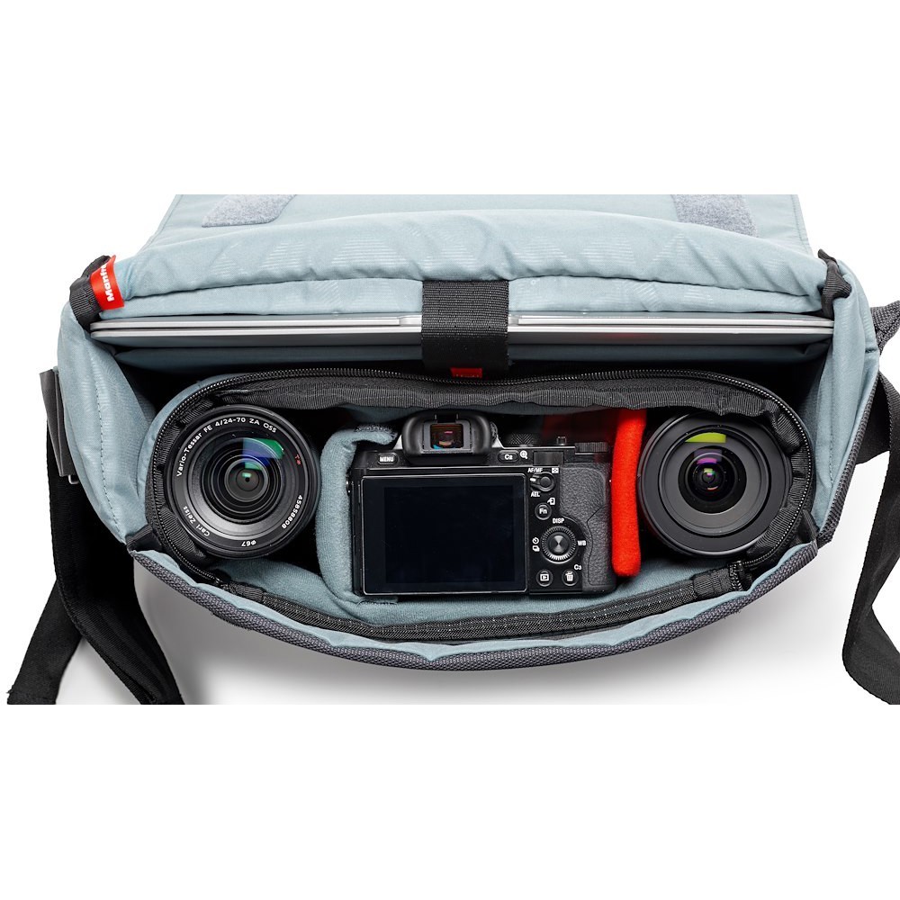 Die Manfrotto Manhattan Speedy-10 verfügt über einen vollständig herausnehmbaren gepolsterten Einsatz mit roten Flexi-Trennwänden, der für die Sony A7/Fuji XT-Serie + Standardzoom + 2 Objektive oder Einsteiger-DSLRs (D3400/1300D) + Objektiv + 2 Extras konfiguriert werden kann. Die Hülle für das 12,9-Zoll-iPad Pro/12-Zoll-Laptop befindet sich in einem separaten Fach auf der Rückseite, während die NeverLose-Klappe vom beschichteten Boden abgenommen werden kann, um kompakte Stative mit den vorderen Schnallen zu sichern. Ein Fahrrad-Stabilisierungsgurt lässt sich am beweglichen Schulterpolster befestigen oder für die Verwendung als Trolley-Hülle verstauen. Durch den schnellen Zugriff über den Reißverschluss an der Oberseite ist die Ausrüstung in Sekundenschnelle einsatzbereit, und durch Entfernen des Einsatzes verwandelt sich die Tasche in eine alltägliche Medientasche. Hochwertiges ballistisches Nylon ist kratzfest, vollständig wasserabweisend und mit einer Regenhülle ausgestattet – perfekt für urbane Radfahrer, Vlogger oder Drohnenpiloten, die Stil, Geschwindigkeit und ganztägigen Schutz benötigen.