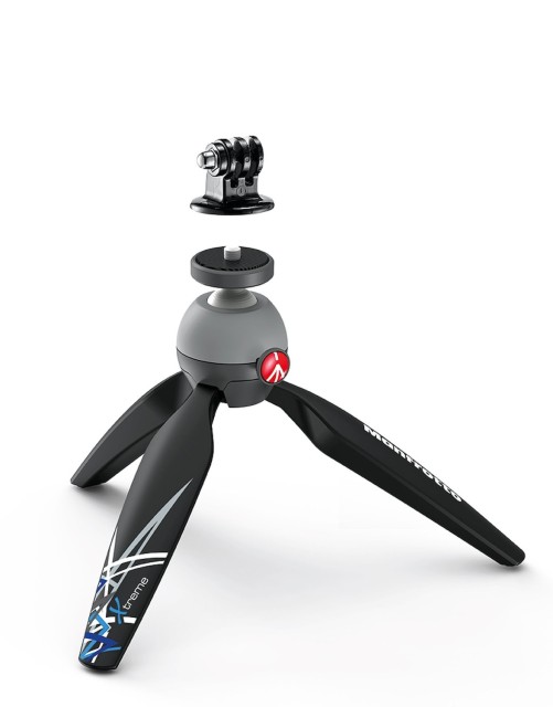 Manfrotto PIXI Xtreme Mini-Stativ mit GoPro-Adapter: Ultraportables 16 cm großes Tisch-/Handstativ mit Druckknopf-Kugelkopf, 1/4"-20-Schraube, Gummifüßen und spezieller GoPro-Halterung – trägt 1 kg bei einem Gewicht von 195 g in einem Edelstahl-/Adapto-Gehäuse.