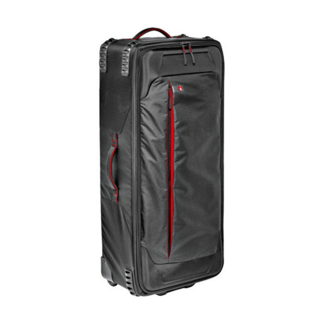 Dieser großformatige, schwarze, wasserabweisende Pro-Light Rolling Lighting Gear Organizer V2 von Manfrotto fasst sechs Kompaktstative, zwei Blitzköpfe und zwei Reflektoren zwischen gepolsterten, berührungsgeschützten Trennwänden im Hauptfach mit Reißverschluss, das 39,4" lang ist. Für Zubehör gibt es eine vordere Außentasche mit Reißverschluss und zwei Innentaschen mit Reißverschluss im Deckel. Sie können die Tasche mit dem seitlichen Tragegriff oder mit den beiden hinteren Transportrollen und dem oberen Tragegriff tragen.