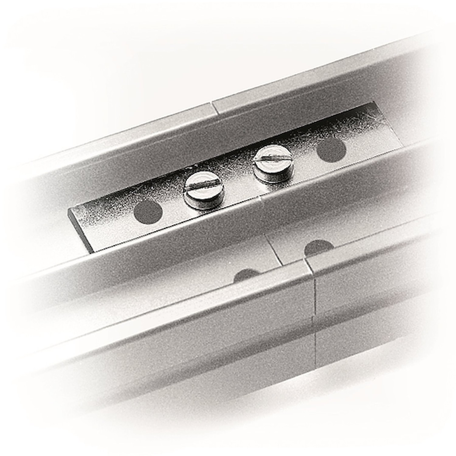 Der Manfrotto FF3208 Schienenverbinder ist ein 84 g schweres Paar Aluminium-Klemmplatten mit Schrauben, das zwei Sky Track-Festschienen über vorgebohrte Löcher an der oberen Führung miteinander verbindet. Für eine sichere und professionelle Kontinuität der Studiodehnschiene ist eine Stützschienenhalterung erforderlich, die über der Verbindungsstelle angebracht wird.