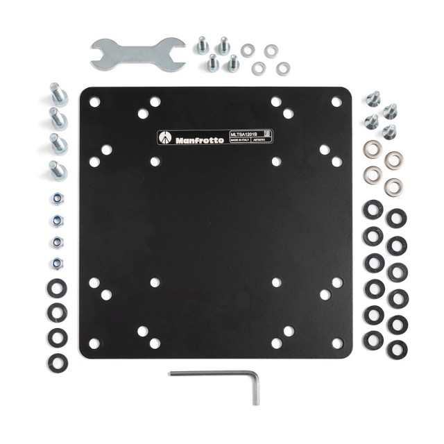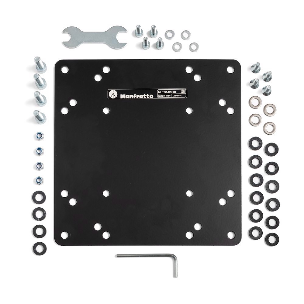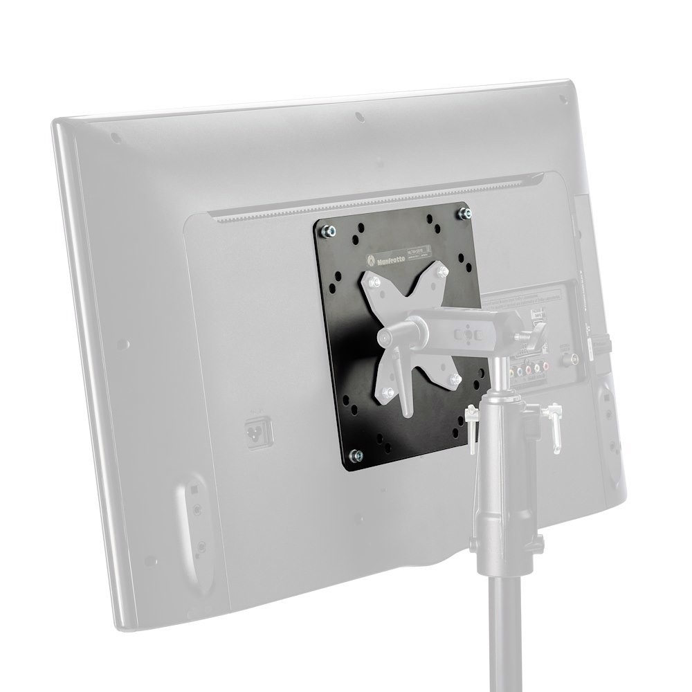 Die Manfrotto TetherGear VESA-Adapterplatte ist ein Zubehör für die TetherGear VESA-Monitorhalterung. Sobald sie sicher an der VESA-Monitorhalterung befestigt ist, können Sie größere Monitore und Bildschirme mit VESA-Konfigurationen von 120x180mm, 180x120mm, 200x100mm und 200x200mm montieren.