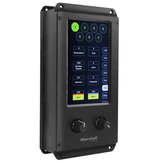 Marshall hat sich mit einem fünffachen Sport-Emmy-Preisträger zusammengetan, um eine eigenständige RCP-Fernsteuerungslösung zu entwickeln, mit der sich Marshall-Übertragungskameras einstellen, malen und anpassen lassen. Die neue 5-Zoll-Touchscreen-RCP-Kamerasteuerungseinheit ermöglicht die Fernsteuerung von bis zu sieben Broadcast-Kameras in einer Entfernung von bis zu 300 m (1.000 Fuß) über ein herkömmliches XLR-Kabel und verfügt über eine neue intuitive Touchscreen-Steuerung mit benutzerfreundlichen Einstellrädern für schnelle Änderungen während des Betriebs.