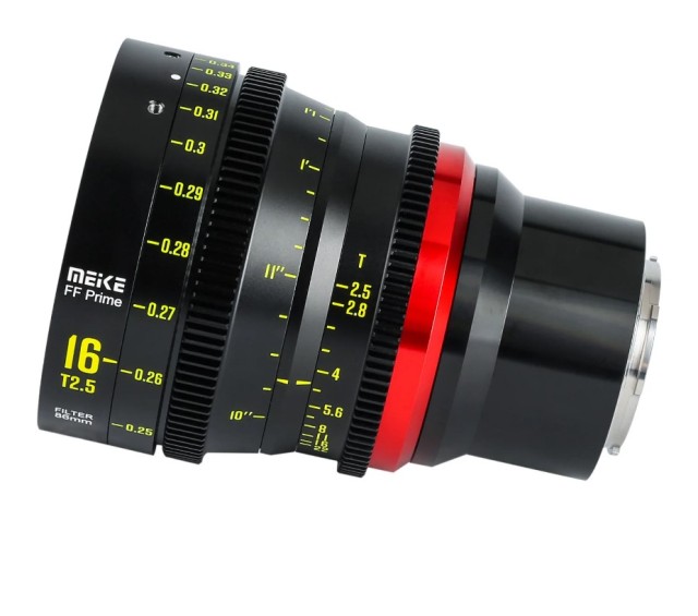Dies ist das sechste FF-Filmobjektiv von Meike, das sich nun in die Familie der FF-Filmobjektive einreiht. Es deckt einen Bildkreis von 45 mm ab. Es ist mit PL-, Canon EF-, Canon RF-, Sony E- und Panasonic L-Anschlüssen erhältlich. Das komplette Set umfasst 16mmT2.5, 24mm, 35mm, 50mm, 85mm, 105mmT2.1 und 135mmT2.4. Das Meike 16mm T2.5 FF-Prime verfügt über eine standardisierte 0,8-mm-Teilung am Fokus- und Blendenring. 16 Elemente in 11 Gruppen bilden das Objektivdesign, der Blendenmechanismus besteht aus 11 Lamellen. Der minimale Fokusabstand beträgt 30 cm.