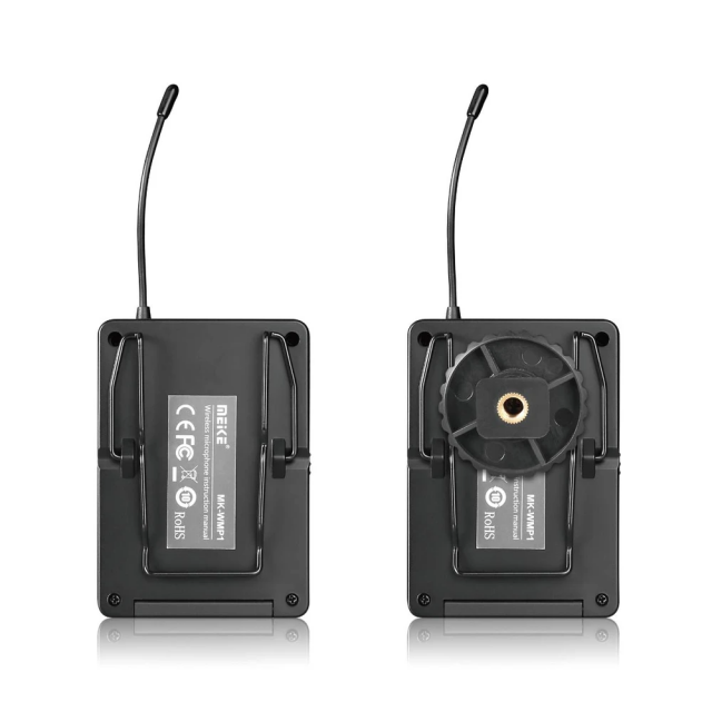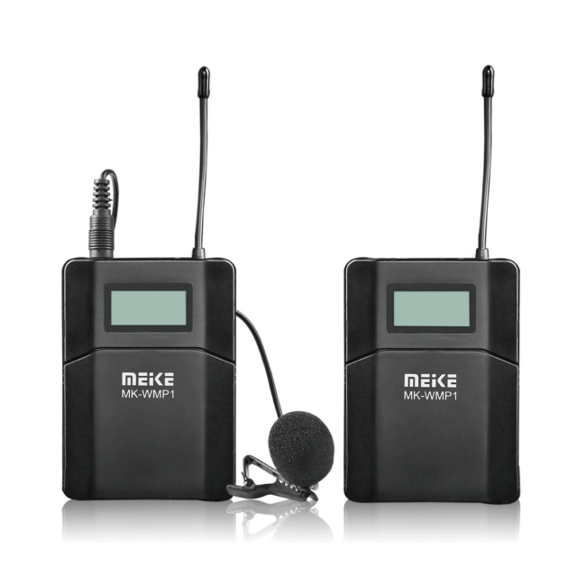 Drahtloses UHF-Audiosystem mit einer Reichweite von ca. 70 m (Sichtverbindung), das im 638-648 MHz-Band (6 Kanäle) arbeitet. Sender und Empfänger werden mit 2x AA-Batterien (nicht im Lieferumfang enthalten) betrieben und haben eine Betriebsdauer von ca. 6+ Stunden. Natürlich ist eine einfache Montage an Kamera/DSLR/DSLM/Telefon möglich (inkl. Reduzierung für Blitzanschluss). Im Lieferumfang enthalten ist auch ein Ansteckmikrofon mit 95 cm Kabel und 3,5 mm Klinkenstecker, das auch mit anderen Geräten verwendet werden kann. Sendeleistung ≦10 dBm, Empfängerempfindlichkeit 12 dB/3 uV, Signal-Rausch-Verhältnis >80 dB.
