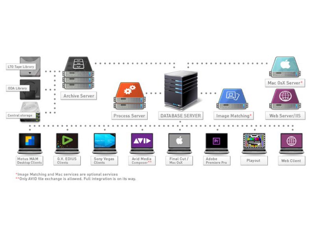 - Verwaltet den Medien-Lebenszyklus von Assets gemäß vordefinierter Regeln Zusätzlich kann er als Backup für andere Server fungieren. Metus Archive Server läuft auf Microsoft Windows 2003 oder 2008 64-bit Server und unterstützt mehrere NAS, DAS und SAN Speichereinheiten. Mehrere MAS-Server können zum Lastausgleich während der Archivierung oder zu Redundanzzwecken installiert werden.